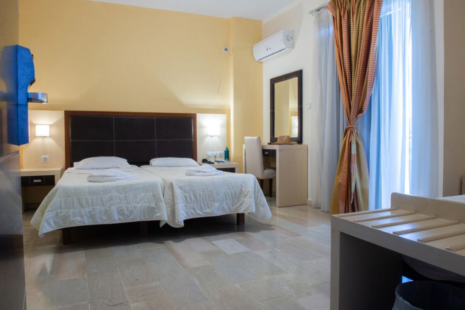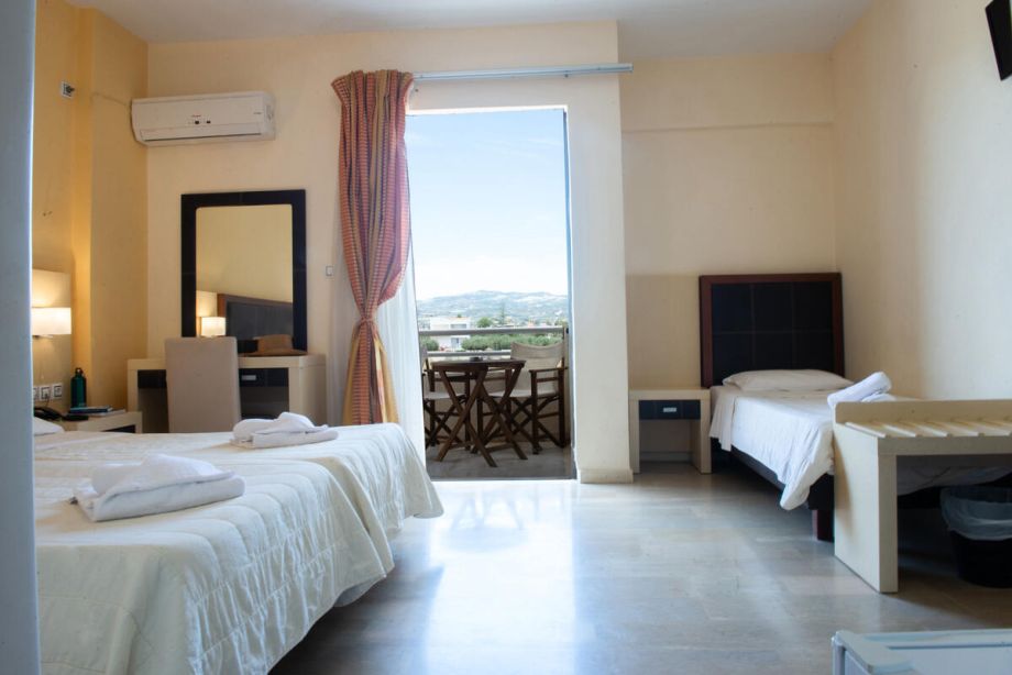 Μοντέρνο και οικονομικό τρίκλινο δωμάτιο με ένα διπλό και ένα μονό κρεβάτι, καθώς και μπαλκόνι με θέα στον κήπο, στην πεδιάδα της Βόχας και τα βουνά της Κορινθίας. Ιδανικό για παρέες και οικογένειες που αναζητούν προσιτή διαμονή σε ξενοδοχείο κυριολεκτικά δίπλα στη θάλασσα. Ανάμεσα στις παροχές περιλαμβάνεται δωρεάν WiFi και κλιματισμός.